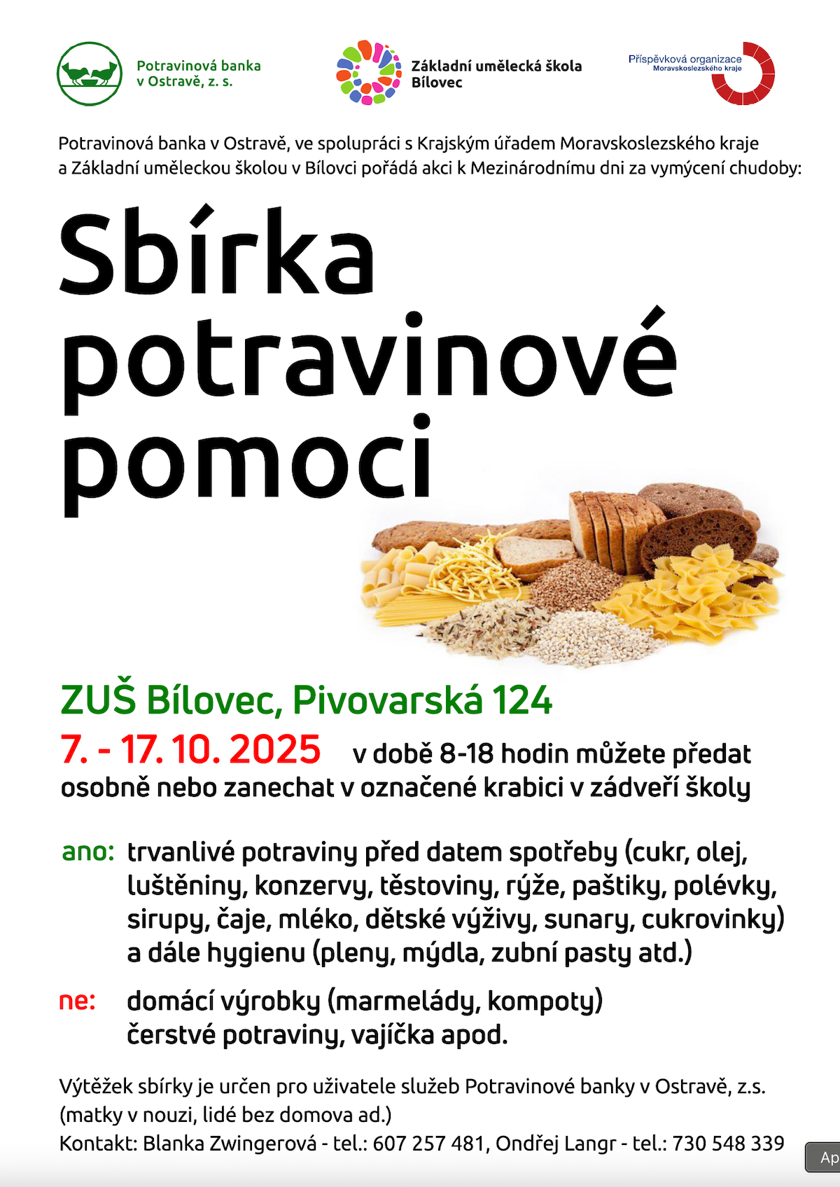 Sbírka určená široké veřejnosti proběhne od úterý 7. října do pátku 17. října 2025 v době od 8-18 hodin v zádveří ZUŠ Bílovec na Pivovarské ulici č.p. 124.