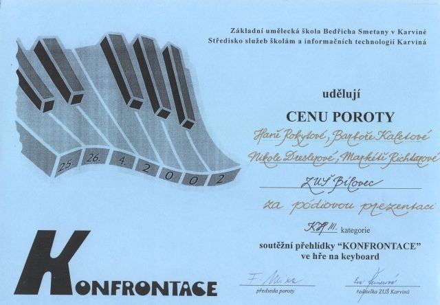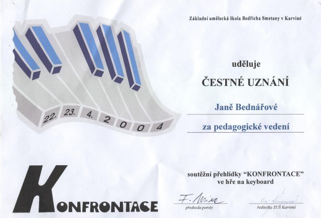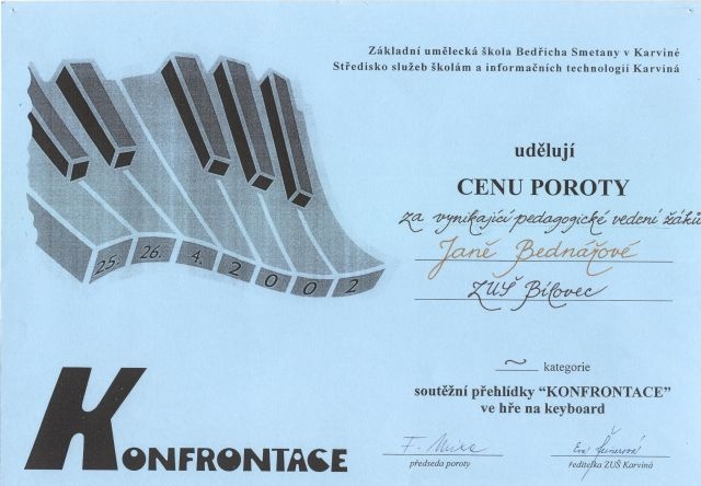 Soutěžní celostátní přehlídky na elektronické nástroje KONFRONTACE v Karviné - 2002-2010 - vždy 1. místo + ocenění za nejlepší výkony a pedagogogickou činnost.