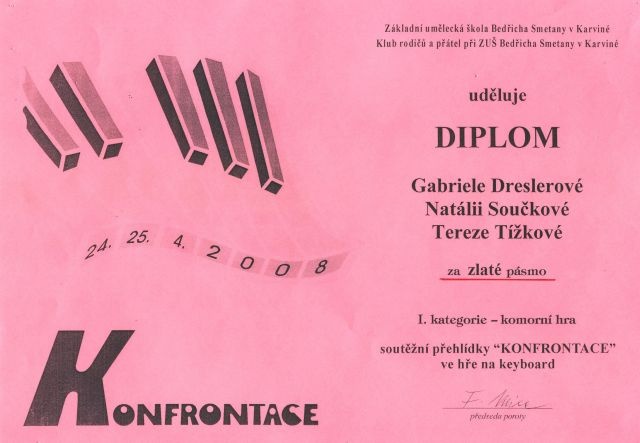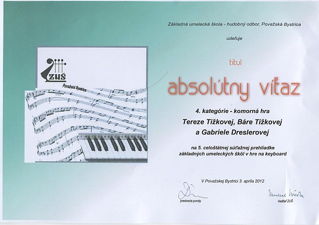 Celoslovenská soutěž s českou účastí ve hře na keyboardy - 3. 4. 2012 v ZUŠ Považská Bystrica - ABSOLUTNÍ VÍTĚZSTVÍ v komorní hře /Bára Tížková,Tereza Tížková, Gabriela Dreslerová/.
