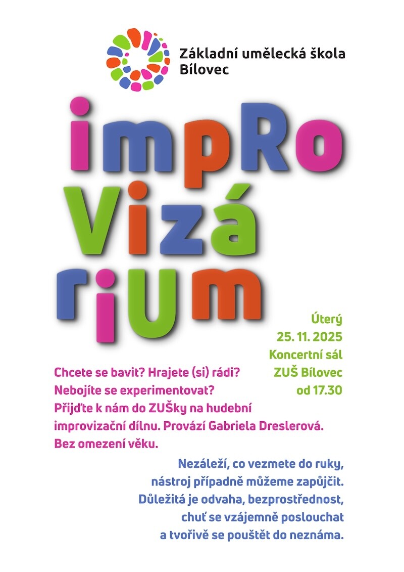 Ve čtvrtek 20. února 2025 proběhla v ZUŠ Bílovec akce s názvem Improvizárium. Cílem nebylo naučit zaměstnance a rodiče žáků ZUŠ vymýšlet improvizované výmluvy, proč vjeli autem do pěší zóny, ale vyzkoušet si hudební improvizaci. Tato hudební „dílnička“ vedená učitelem hry na kytaru, klavír, skladby a improvizace, panem Vojtěchem Jandou (alias Vojta Violinist) si kladla za cíl ukázat účastníkům, jak může vznikat hudba „jen tak“.